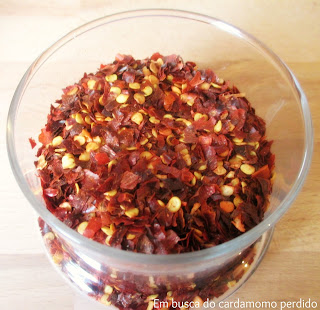 - Numa frigideira colocar as sementes de coentros, os cominhos e os flocos de chilli e deixar torrar um pouco.